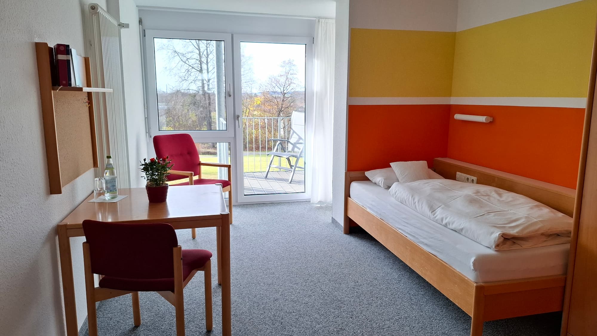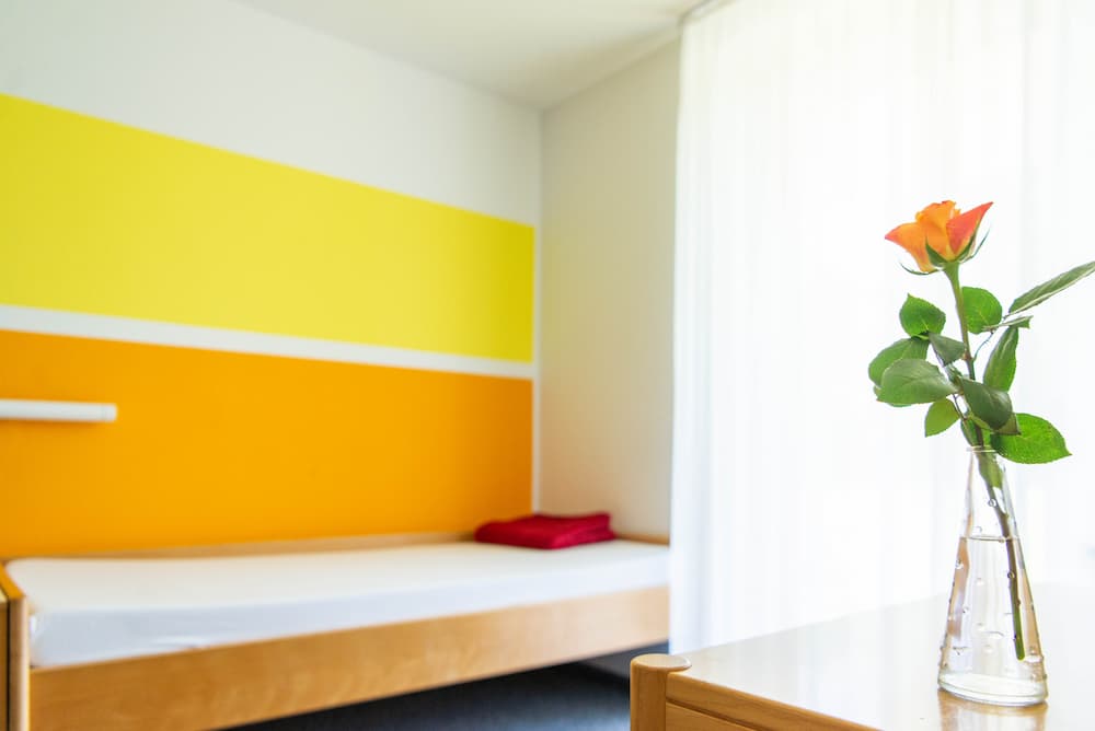 Sie wohnen in einem der 47 Einzelzimmer. Alle mit Dusche, WC, Telefon und Balkon. Von dort aus genießen Sie einen wunderschönen Blick in die Natur.